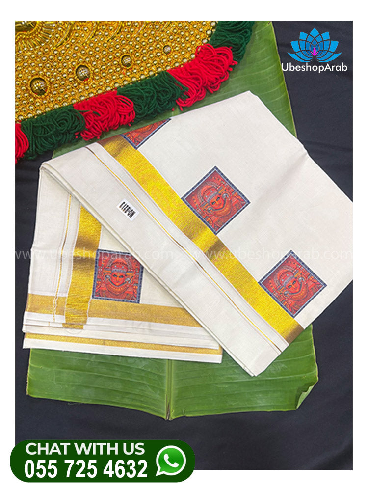 The Kerala Style Theyyam Model Dhoti features striking prints inspired by the vibrant Theyyam art form, a symbol of divine expression in Kerala’s culture. Perfect for traditional festivals and cultural events, this dhoti blends heritage with bold artistic flair.