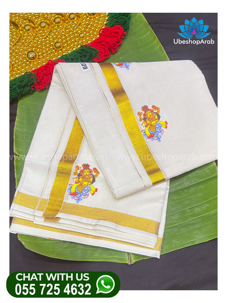 The Sree Krishna Mural Print Dhoti is a traditional attire featuring intricate mural-style prints of Lord Krishna. Inspired by Kerala's temple art, this dhoti combines spiritual elegance with cultural heritage, making it perfect for festive and devotional occasions.